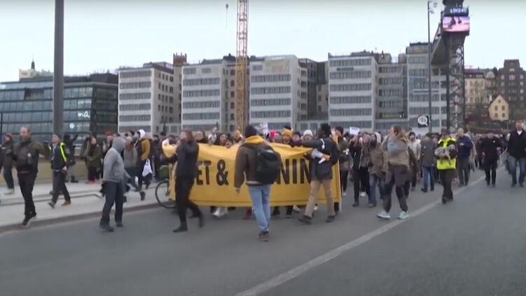 В Стокгольме горожане вышли на улицы в знак протеста против карантинных ограничений. Скриншот из видео