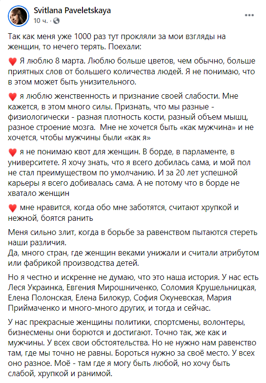 Издатель Светлана Павелецкая опубликовала в Facebook обстоятельный пост, в котором объяснила, почему она любит 8 Марта и почему не считает необходимым превращать его в арену гендерной битвы.