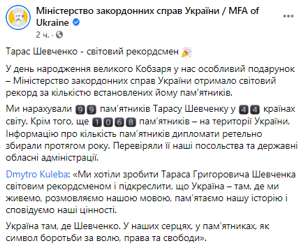 "В день рождения великого Кобзаря у нас особый подарок - Министерство иностранных дел Украины получило мировой рекорд по количеству установленных ему памятников", - рассказали в ведомстве.