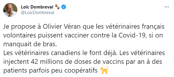 "Я предлагаю Оливье Верану (министр здравоохранения - Ред.), что ветеринары могут быть привлечены к проведению вакцинации против Covid-19, если возникнет нехватка специалистов", - заявил депутат.