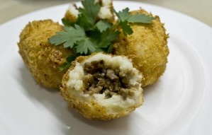 Отдельно моем и режем грибы, шинкуем лук, все обжариваем на растительном масле. Добавляем в начинку мелко нарезанные оливки с зеленым луком. На небольшом куске марли, смоченной в холодной воде формируем зразы: на картофельный слой выкладываем начинку и скатываем в лепешку. Готовые зразы обваливаем в муке и жарим на растительном масле около 5 минут.