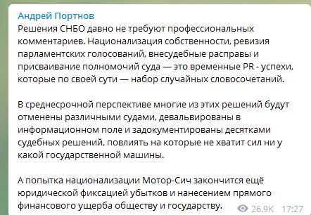 А попытка национализации "Мотор-Сичи" закончится ещё юридической фиксацией убытков и нанесением прямого финансового ущерба обществу и государству", - написал юрист Андрей Портнов.
