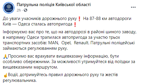 Отмечается, что на автодороге в районе шинного завода, в направлении Одессы произошла авария с участием трех транспортных средств: MAN, Opel, Renault. Патрульные полицейские занимаются регулированием движения.