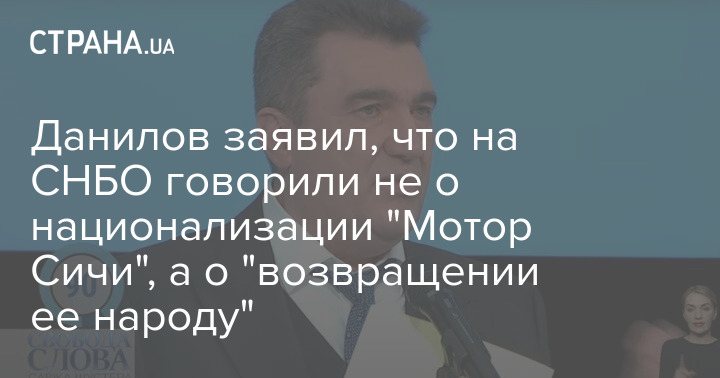 Секретарь Совета национальной безопасности и обороны Алексей Данилов заявил, что на заседании органа 11 марта речь не шла о национализации запорожского предприятия "Мотор Сич". По его словам, участники говорили о возвращении промышленного гиганта "в собственность украинского народа".