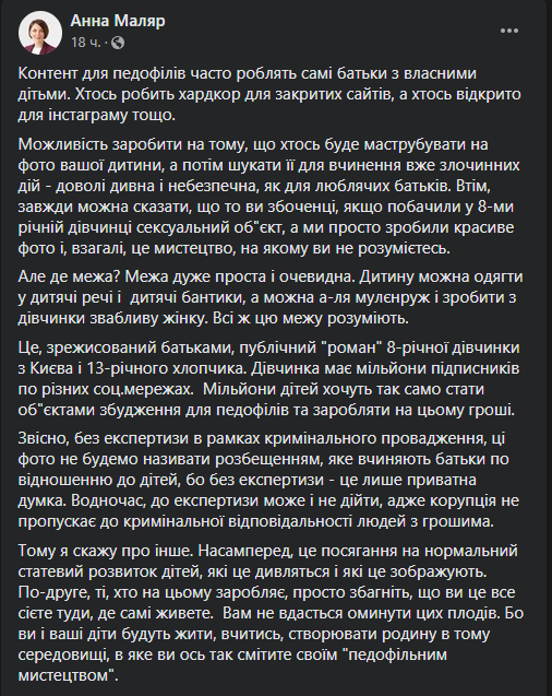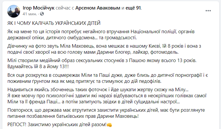 "Как по мне, эта история требует немедленного вмешательства Национальной полиции, органов государственной опеки, детского омбудсмена и общественности. Девочку на фото зовут Мила Маханец, она живет в нашем Киеве, ей 8 лет и она с подачи своей больной на всю голову мамы Дарьи - блоггер, лайкар, фотомодель. Миле создали медийный образ сексуальных отношений с Пашей которому всего 13 лет. Вдумайтесь ей 8 а ему 13! Вся эта раскрутка в соцсетях Милы и Паши очень, очень близка к детской порнографии и является питательной почвой которая как мед притягивает и стимулирует к действиям педофилов.