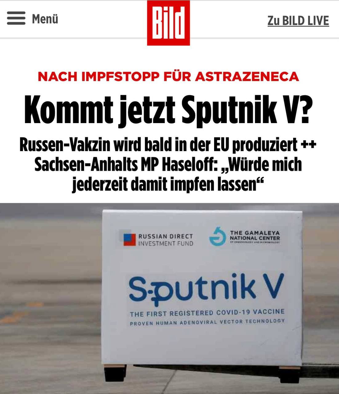 В СМИ Германии уже выходят обложки, где обсуждается "пришествие" Спутника - на фоне остановки вакцинации "АстраЗенекой". Там приводится мнение премьера земли Саксония-Анхальт Райнера Хазелоффа, который говорит: "Я бы привился им в любое время".