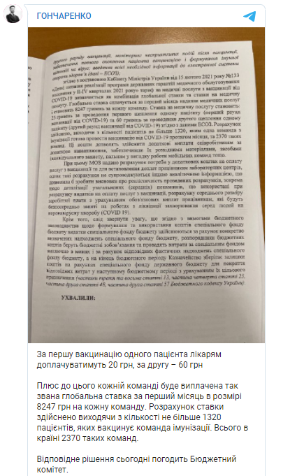 "Плюс к этому каждой команде будет выплачена так называемая глобальная ставка за первый месяц в размере 8247 грн на каждую команду. Расчет ставки осуществлен исходя из количества не более 1320 пациентов, которых вакцинирует команда иммунизации. Всего в стране 2370 таких команд", - написал нардеп.