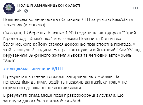 Отмечается, что на трассе столкнулись военный КамАЗ под управлением 39-летнего жителя Львова, и легковой автомобиль Audi.