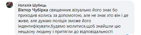"Священник визуально его знает , так как приходил когда-то за помощью, но не знает кто он и где живет, но думаю полиция сможет его идентифицировать, будем молиться, чтобы нашли этого несчастного человека и привлекли к ответственности", - написала в соцсети одна из прихожанок.