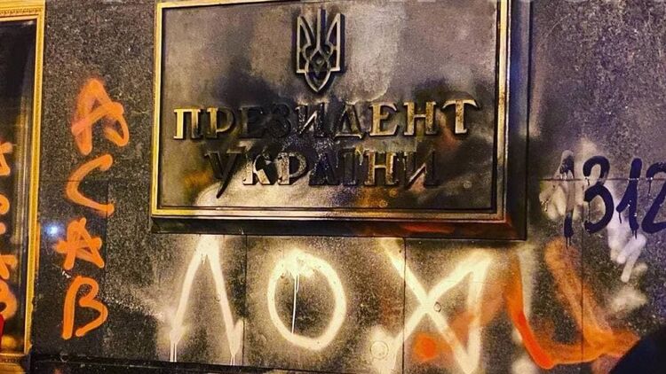 В ролике запечатлены моменты погрома, когда его участники разрисовывают фасад здания офиса Зеленского, жгут двери и табличку.