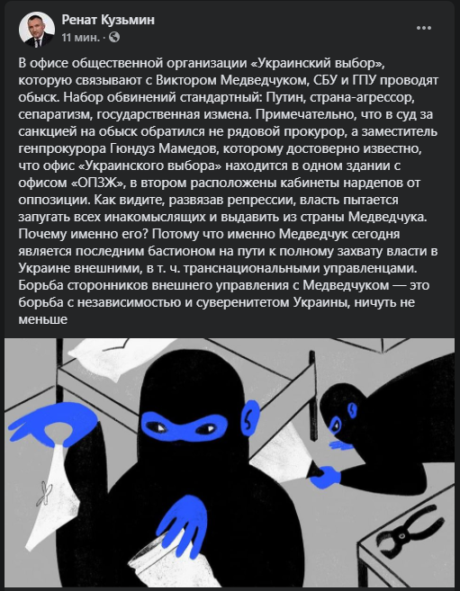 "Набор обвинений стандартный: Путин, страна-агрессор, сепаратизм, государственная измена. Примечательно, что в суд за санкцией на обыск обратился не рядовой прокурор, а заместитель генпрокурора Гюндуз Мамедов, которому достоверно известно, что офис "Украинского выбора" находится в одном здании с офисом "ОПЗЖ", в втором расположены кабинеты нардепов от оппозиции. Как видите, развязав репрессии, власть пытается запугать всех инакомыслящих и выдавить из страны Медведчука. Почему именно его? Потому что именно Медведчук сегодня является последним бастионом на пути к полному захвату власти в Украине внешними, в т. ч. транснациональными управленцами. Борьба сторонников внешнего управления с Медведчуком — это борьба с независимостью и суверенитетом Украины, ничуть не меньше", - пишет Кузьмин