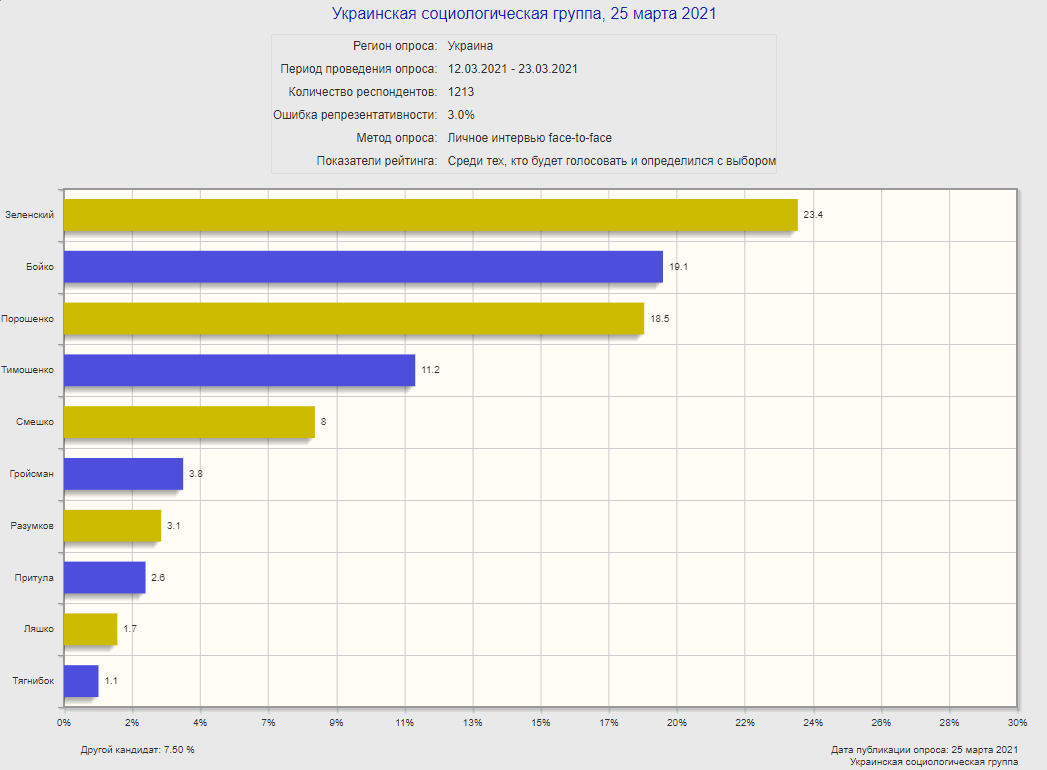 Следом за действующим президентом - сопредседатель парламентской фракции "Оппозиционная платформа - За жизнь" Юрий Бойко с поддержкой 19,1%. Замыкает тройку лидеров экс-президент и сопредседатель фракции "Европейская солидарность" в Раде Петр Порошенко - 18,5%. Об этом свидетельствуют результаты опроса Украинской социологической группы, опубликованные 25 марта.