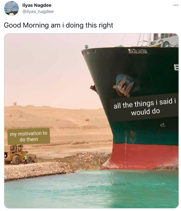 Другие сравнивают свой прогресс (в образе небольшого экскаватора) с огромным списком дел (в форме севшего на мель сухогруза).