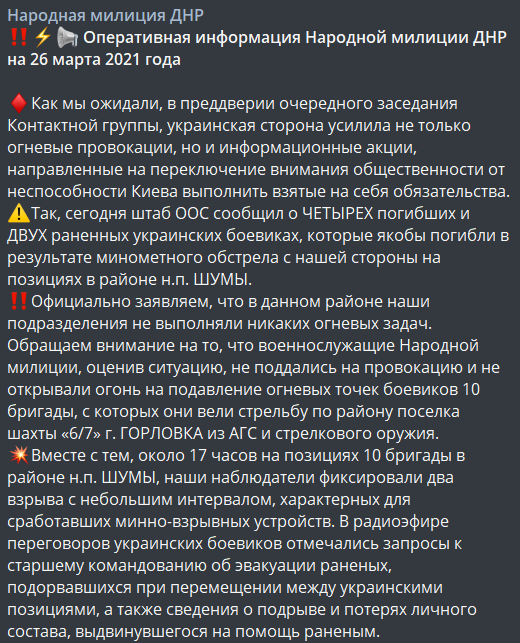 При этом нужно помнить, что в понедельник в самой "ДНР" заявляли о потерях. 22 марта представители "республики" заявили о гибели двух своих солдат на севере Донецка при обстреле "Вольво-центра".
