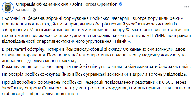 "Могу подтвердить, что у населённого пункта Шумы в Донецкой области, предварительно, в результате миномётного обстрела со стороны незаконных вооружённых формирований так называемых "ДНР" погибли четверо военнослужащих Вооружённых сил Украины", - добавил советник главы ОП Ермака Алексей Арестович.