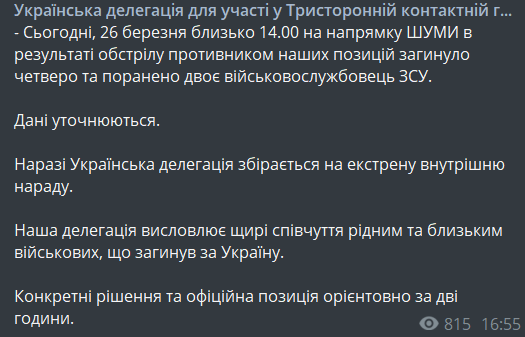 По заявлению делегации, в 14:00 под Шумами в Донецкой области произошел минометный обстрел со стороны "ДНР". В итоге погибли четверо и ранены двое солдат.