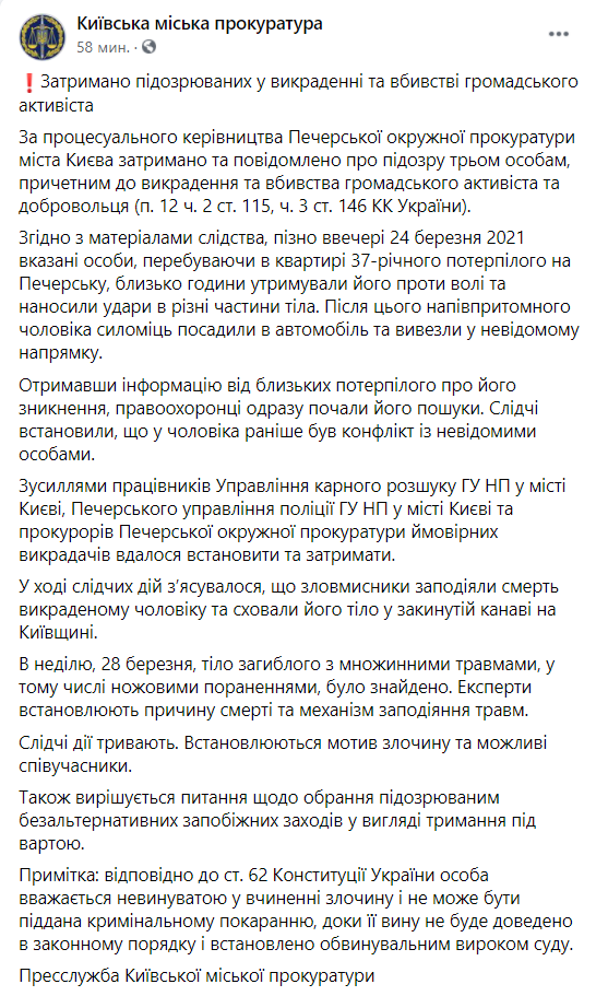 Полиция задержала подозреваемых в похищении и убийстве общественного активиста и добровольца в Киеве.
