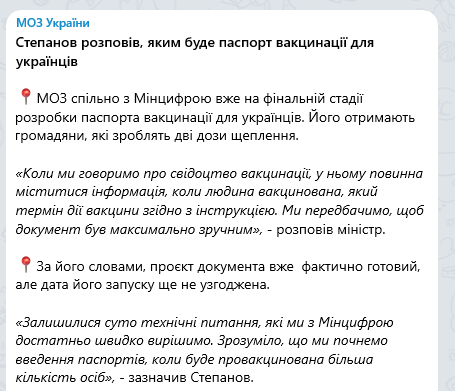 Министерство здравоохранения совместно с Министерством цифровой трансформации уже на финальной стадии разработки паспорта вакцинации для украинцев. Его получат граждане, которые сделают две дозы прививки.