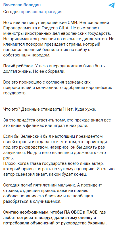 Как уже говорилось, сегодняшние заявления о смерти ребенка ни Украина, ни ОБСЕ пока не комментируют. При этом на эпизоде заострили внимание российские власти. В частности, спикер Госдумы Вячеслав Володин - он обвинил Украину и лично Зеленского в трагедии. И призвал исключить Киев из ПАСЕ.