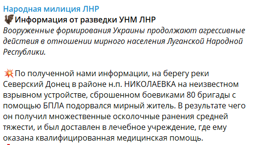 После обвинений в применении беспилотника против гражданских в "ДНР", похожее заявление последовало из Луганска. В поселке Николаевка на брошенной с БПЛА взрывчатке подорвался местный житель. Он жив, других подробностей случившегося нет.