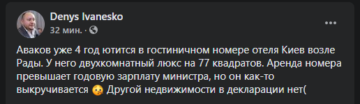 В декларации за 2020 год глава МВД указал аренду номера в гостинице "Киев" общей площадью 77,6 м2. Согласно информации на сайте гостиницы, номера такого размера стоят от 3 754 гривен за сутки. То есть за год Арсен Аваков тратит около 1 351 440 гривен на аренду жилья в столице.
