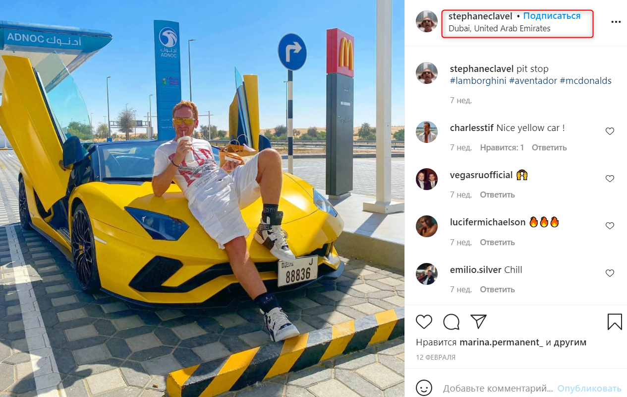 В Инстаграме Клавеля есть фото из Дубая, где он был полтора месяца назад. В то же время сам он в комментарии "Стране" свою причастность к скандальной фотосессии отрицает.