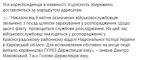 Приказом от 6 апреля военнослужащих освободили от должностей. "По данному факту проводится служебное расследование. В настоящее время военнослужащие находятся в распоряжении в Красноградском районном отделе Национальной полиции Украины в Харьковской области", - заявил временно исполняющий обязанности главы Госспецсвязи Дмитрий Маковский.