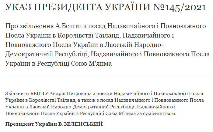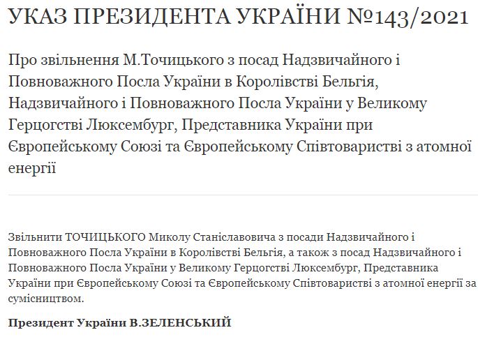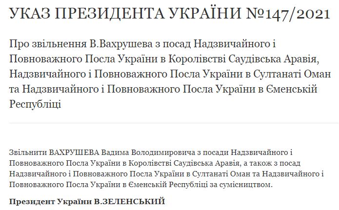 В частности, уволены посол Украины в Королевстве Нидерланды Всеволод Ченцов, посол в Бельгии, Люксембурге, представитель Украины при Европейском союзе Николай Точицкий, посол в Ираке Виктор Недопас, посол в Таиланде, Лаосе и Мьянме Андрей Бешта, а также посол в Саудовской Аравии, Султанате Оман и Йеменской Республике Вадим Вахрушев.