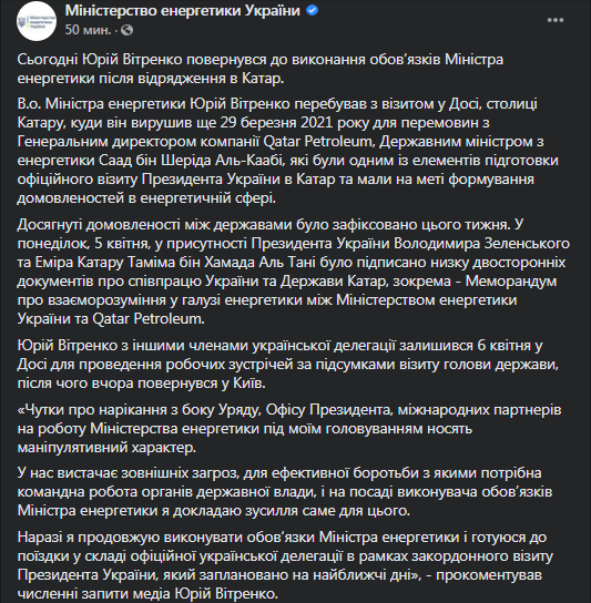 Также в Минэнерго рассказали о том, что Витренко вернулся к исполнению обязанностей министра энергетики после командировки в Катар 8 апреля. В Дохе он пребывал с 29 марта в рамках подготовки визита Зеленского в Катар.