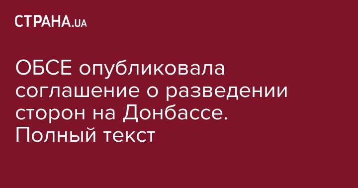 Организация по безопасности и сотрудничеству в Европе (ОБСЕ) обнародовала полный текст сегодняшнего решения Трехсторонней контактной группы в Минске о разведении сил и средств на Донбассе. Докумен, который состоит из 12 пунктов, был обнародован на сайте ОБСЕ.