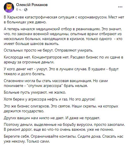Как написал журналист Алексей Романов, мест в харьковских больницах нет уже давно.