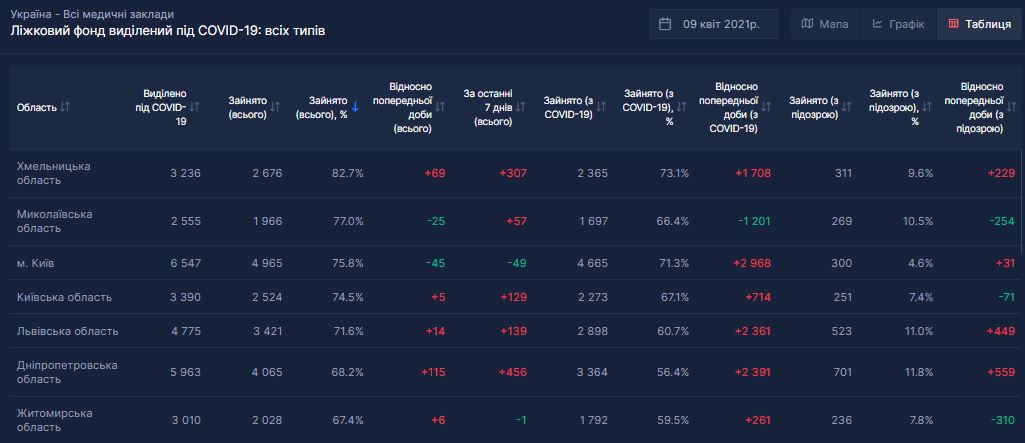 По состоянию на 9 апреля в семи регионах и Киеве загружено более 65% ковид-коек в больницах. Это верхний допустимый показатель, который установил Минздрав.