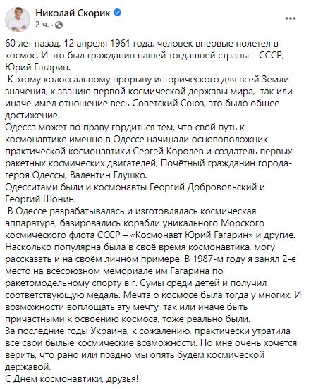 За последние годы Украина, к сожалению, практически утратила все свои былые космические возможности. Но мне очень хочется верить, что рано или поздно мы опять будем космической державой. С Днём космонавтики, друзья!" - написал нардеп.