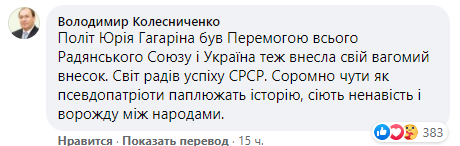 "Полет Юрия Гагарина был Победой всего Советского Союза и Украины, которая тоже внесла свой весомый вклад. Мир радовался успеху СССР. Стыдно слышать как псевдопатриоты порочат историю, сеют ненависть и вражду между народами", - пишет блогер Владимир Колесниченко.