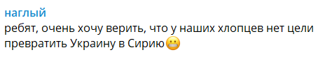 "Просить у Штатов как не кредит, так войну - отличный план Б", - пишет Назаров. "Очень хочу верить, что у наших хлопцев нет цели превратить Украину в Сирию", - добавил он.