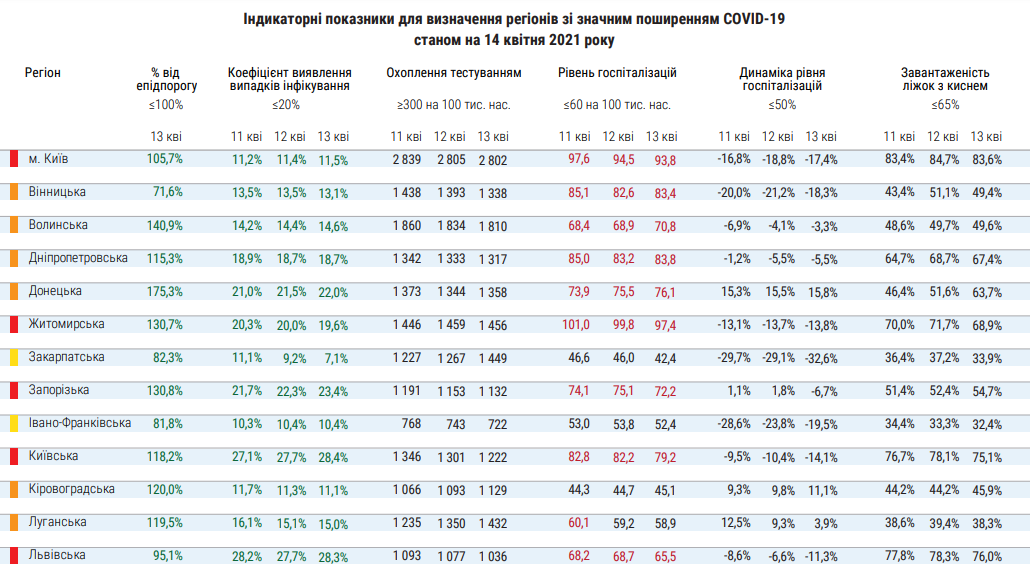 В Донецкой области превышена норма по коэффициенту выявления случаев инфицирования - за последние три дня этот показатель составляет 21%, 21,5% и 22% при норме 20%. Также в этом регионе увеличен показатель госпитализаций - 73,9, 75,5 и 76,1 при норме 60. В Черкасской области превышены такие же показатели - 22,9%, 25% и 23,2% и 92,3, 91,8 и 89,7, соответственно.