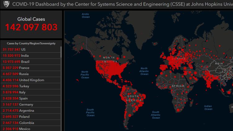 По данным на 20 апреля, число зараженных на Земле перевалило за 142 миллиона, фото: университет Дж. Хопкинса
