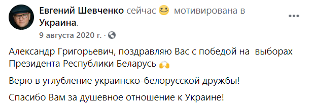 "Александр Григорьевич, поздравляю Вас с победой на выборах Президента Республики Беларусь. Верю в углубление украинско-белорусской дружбы! Спасибо Вам за душевное отношение к Украине!" - написал Шевченко. Он также утверждал, что белорусы протестуют якобы потому, что им "приелась стабильность".