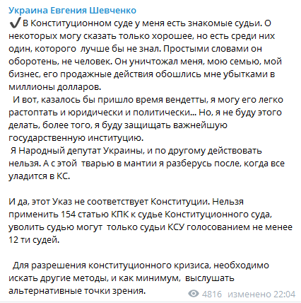 Также Евгений Шевченко был противником президентского указа об отстранении главы Конституционного суда Александра Тупицкого.