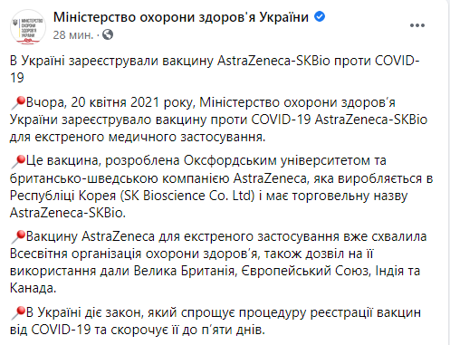 "Украина получила информацию от COVAX о поставках от 2,2 до 3,7 млн доз вакцин Oxford/AstraZeneca в I-II квартале 2021 года. Кроме того, эта вакцина будет закуплена за государственные средства напрямую у производителей", - добавили в ведомстве.