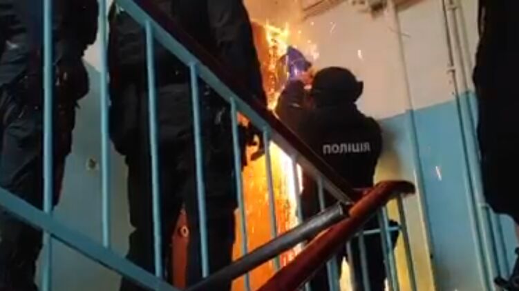 На видео, которое публикует киберполиция, запечатлено, как правоохранители выбили входную дверь в квартиру злоумышленников, после чего изъяли деньги, документы, компьютерную технику, мобильные телефоны, банковские карты.