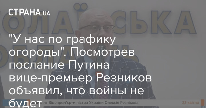 Вице-премьер-министр, министр по вопросам временно оккупированных территорий Алексей Резников заявил, что войны с Россией сейчас не будет. По его словам, причина заключается в том, что в Украине близится огородная страда.