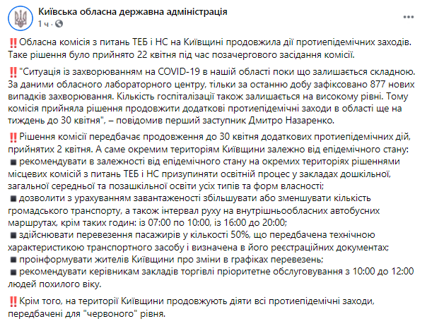 Действие усиленных карантинных ограничений на территории Киевской области продлено до 30 апреля. Такое решение приняла областная комиссия по вопросам техногенно-экологической безопасности и чрезвычайных ситуаций (ТЭБ и ЧС) на внеочередном заседании. Об этом сообщается на странице Киевской ОГА в соцсети.