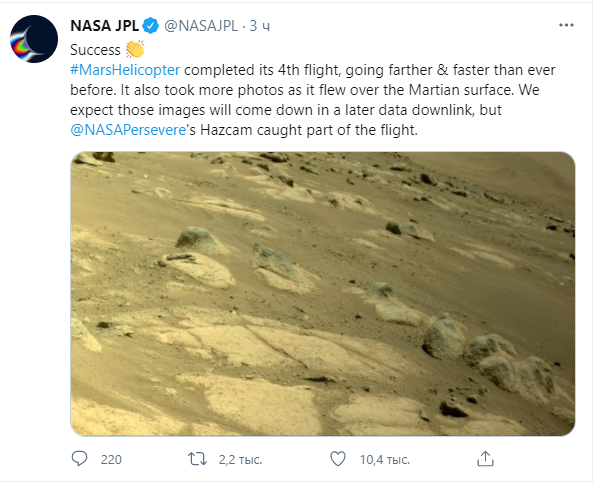 "Марсианский вертолет осуществил четвертый полет, переместившись с большей скоростью и на большую дистанцию, чем ранее", - сообщили ученые