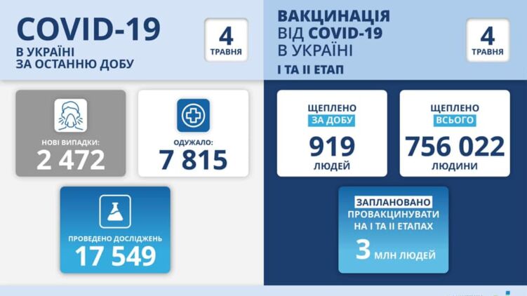 По его данным за понедельник, 3 мая было привито 919 человек по всей Украине. Теперь в стране 756 022 человека вакцинировано.