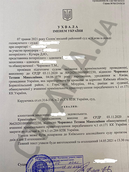 Соломенский районный суд Киева в пятницу, 7 мая, закрыл уголовное дело против народного депутата VIII созыва Татьяны Черновол на основании 284 статьи - окончание срока досудебного расследования. Черновол обвиняли в препятствовании законной профессиональной деятельности журналиста (ч.1 ст.171 УК).