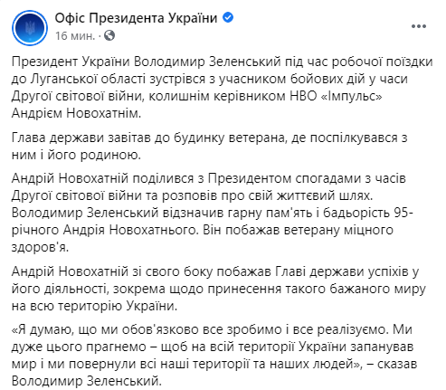 Во время беседы с Зеленским Андрей Новохатний поделился воспоминаниями со времен Второй мировой войны и рассказал о своем жизненном пути. В свою очередь, президент пожелал ветерану крепкого здоровья, добавив, что он 95-летний ветеран в хорошей форме.