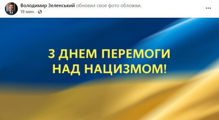 07:30 Владимир Зеленский поменял фото обложки на Facebook. "С днем победы над нацизмом!" гласит надпись на фоне украинского флага.
