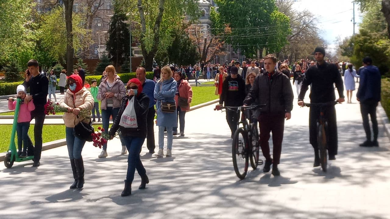 09:09 Простые люди уже в парке. Все с цветами и многие - с портретами своих предков.