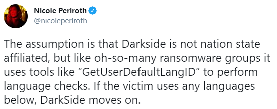 Журналистка The New York Times Николь Пирло написала твит, в котором заявила, что в Darkside хоть и не связывают себя с отдельными государствами, но используют языковые настройки компьютеров-жертв.